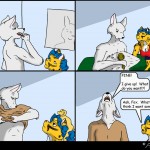 Fox sitting at his desk, eyes closed, ice pack on his forehead. (Maybe same panel from previous comic)
