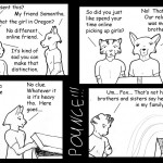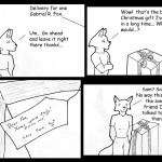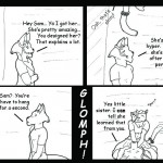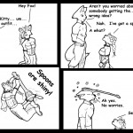 Fox walking in to the theater, ears and tail drooping, waiving halfheartedly at Essie.