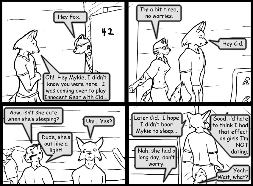 Today's comic notes a particular oddity of my relationship with Cid and Mykie IRL. It hasen't hapened so much recently, but she has a tendency to fall assleap when I'm around. :: grin :: Of course it could be that I was hangign out over at Cid's at like 12 - 4 in the morning.