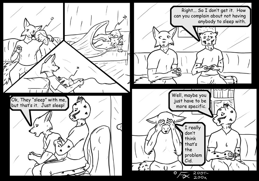 Todays comic went through a whole bunch of versions, in terms of the text, before I settled on this one. I didn't really settle on this because I thought it was the best, it was just the version that I was on when I saved it last. :: grin :: But I think that it worked well. I don't know why I keep coming back to the whiny Fox-wants-to-get-laid jokes, but I guess they still seem funny to me. :: shrugs ::