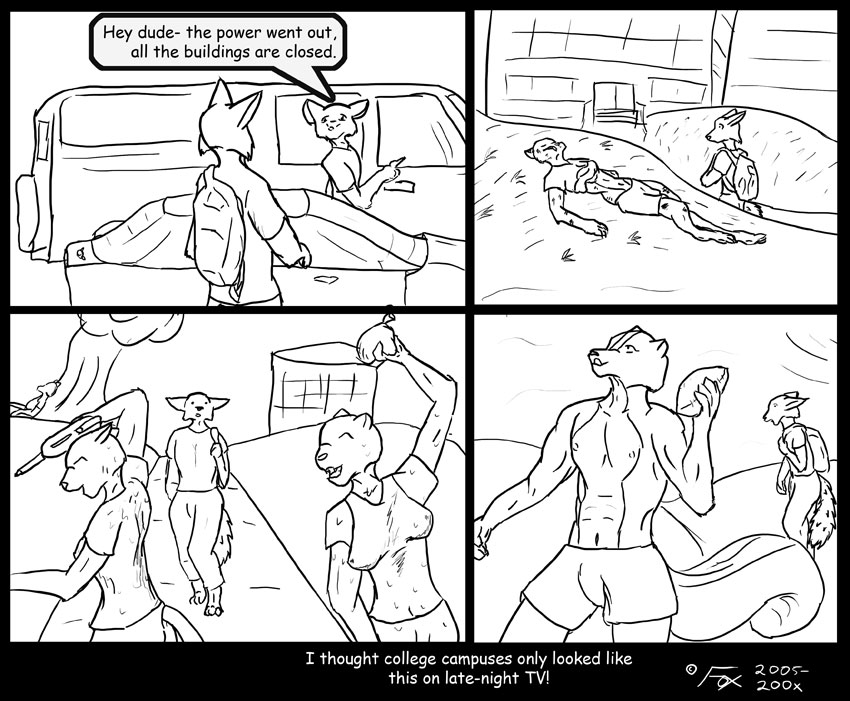 Todays comic is based on real life. This monday was a HOT day (at least around these parts, which means it was between 85 and 99). The power went down on campus so I ended up waiting around on the quad for my class to see if it would be open. All these students lounging around on the grass in various states of undress... It looked like a scene from a softcore...
