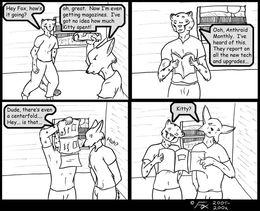 See today's Comic... well it's crap. I liked the joke, but Cid looks all kinds of stretched out in panel 2, and a bunch of details are missing in the last one... Oh, and the joke changed mid process. Kitty wasn't in the magazine until, literally, twenty seconds before I saved the finalized version. :: lol :: So that's a little odd.