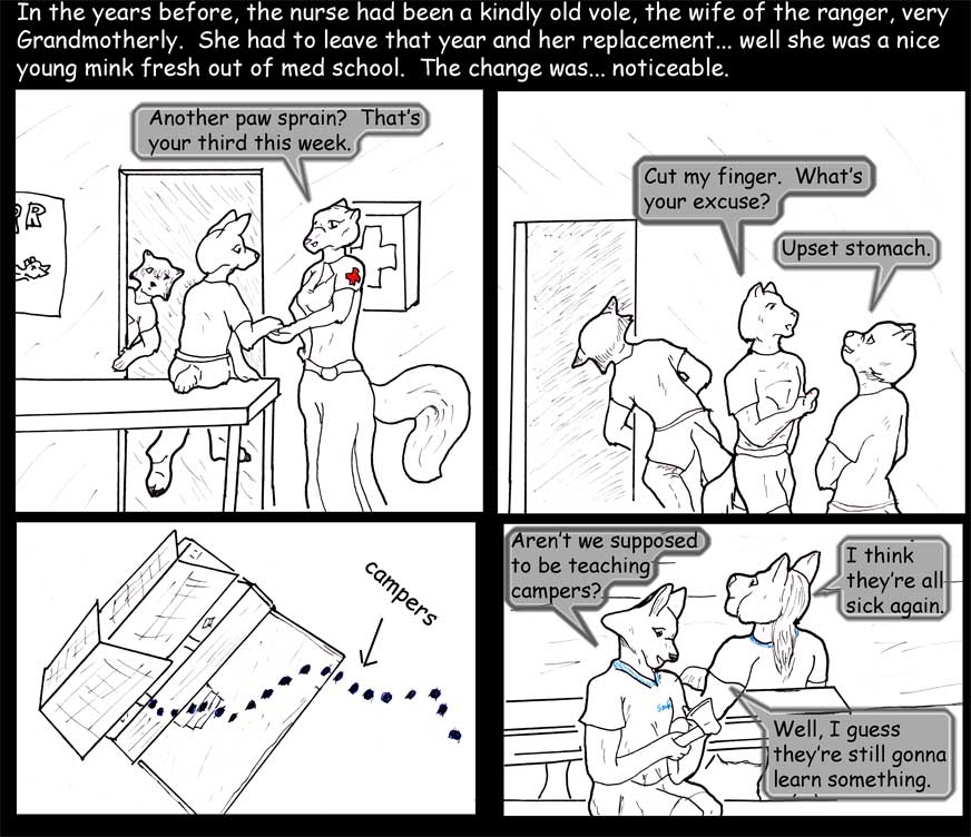 Hey Fox is pretty on the mark with this one. No kidding. Nothing like confining a camp full of boys in the woods for seven weeks with the only females within a dozen miles being "Jakie" (who could kick any of the guys asses, without blinking) and a hot blond wearing a nurses outfit. Let's think this out for a minute... I have never seen so many "twisted" ankles, poison oak rashes, bee stings, nicks, cuts, scrapes, and upset stomachs!