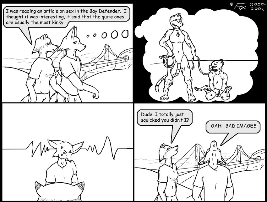 Todays comic is sort of a culmination of the standing jokes. And just in case it's not clear enough, Fox pinged on Cid and Mykie as the "quiet ones." Bit of background knowledge? I cleared this comic with them before I posted it. Cid said "it's ok, as long as it doesn't turn into a running gag." I honestly hadn't thought of that... Bah, but I said ok... :: shrug ::