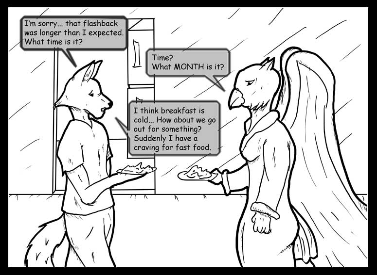 Hey everybody! Welcome back to regular old Hey Fox no more Summer Daze camp shenanigans. :: grin :: at least not for the foreseeable future. I won't, however, promise an absolute end to all summer camp or scout jokes... just that the series is over. Isn't that a fun word? "Shenanigans" it's got all this great suggestion of mischief and fun, with an edge of trouble, and a dash of Irish, for no apparent reason. Than again, that may all be just in my head. Anyway, todays comic brings us full circle to the beginning of this whole crazy thing! Don't have any idea what Fox and Secret are talking about? Why is she in a bath robe? What the heck is that supposed to be on the plates? Check back here to refresh your memory!