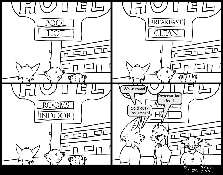 Ooh, I've been wanting to put up today's comic for a while now! Mostly because it really happened. Ok the words were a bit different, but there was this scrolling sign in front of a hotel (in Arizona... I think...) that was advertising each of it's amenities and a description. But if you looked up at the sign at the wrong time, there was no particular context for where one description ended and another began. This lead to much humor and discussion while we looked for a different hotel to sleep in.