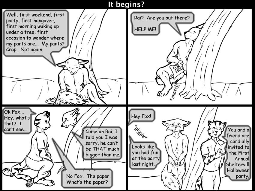 I told you there would be a bit of a twist, and this is it. Well sort of. More like an unexpected turn than a twist. Anyway, todays comic seems to have left Fox with some more bad luck. Perhaps it's the day. (if you're confused, look at the time stamp and know it's a Friday.) Oh, and before you ask; No, todays comic is NOT based on RL events. In fact this run of Faire has been a surprisingly dry one (in terms of liquor). Monday will explain a bit more what this whole "Shelterville" thing is all about, and will come with a bevey of links! Curious yet? You'll see.