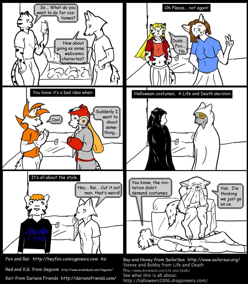 The cameo's begin! Todays comic is the first in a string of cameo heavy posts. This is, by the way, the twist I was talking about. I can't remember if I mentioned or not, but here's the long and short. Look over here and you'll see it all as it goes up. A Halloween crossover comic extravaganza! Well.. you know, something like that. :: grin :: The URL's of the comics I reference or cameo will appear at the base of each comic, so make sure you check out the origins. Basically, I figure if I can give their readers a bump, they might give me one.