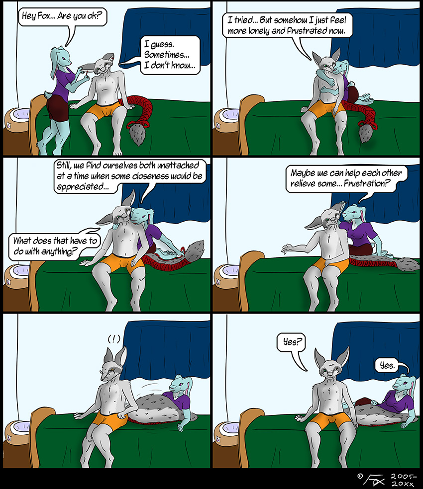 While I am certainly not opposed to these two spending some quality time together, I can’t help but remember a previous rant where you were extremely emphatic that Pixi would never be anything but strictly platonic toward Fox. I get that she is not offering a relationship, just some mutual stress relief, but that still seems a small step out of character for her. Have you actually reconsidered the possibility of more closeness between these two?