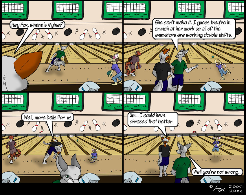As for the pictures this time around, I'm messing around with drawing scenes from further away to get in more of the physical of what's happening... I don't know if I like it or not yet, but it's different. I also find it a lot more difficult to keep consistent detail when the characters are so small. Part of the challenge here was conveying a sense of how much time passed during the conversation portrayed. It makes the background joke a lot more funny (I think) to understand that Fox and Pwyll bowl a full frame each during this comic... Oh well.