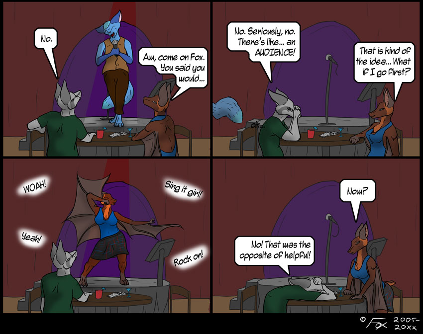 Fox seems a little less than ecstatic to be up in front of a crowd, and doesn't seem to be particularly inspired to follow her example...