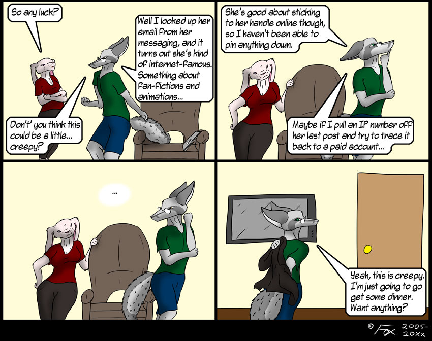 I like drawing characters putting on and taking off coats... I'm not really sure why. Still, I mostly liked how Fox turned out in panel 2. Contemplative.