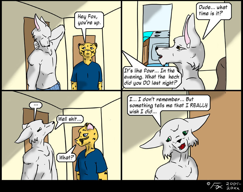 Anyway there's been a lot of work going on around here, moving the site and all. As for this comic, I actually really like how the Fox's expressions turned out in panels one and three. I'm really not very good at colors, but I think the characters are alright. The apartment always looks too drab to me, but when I try to add more details it gets super crowded. I haven't quite figured out the happy medium yet. Maybe I need textures instead... yeah... because what I need is one more thing to slow the production down. >.>